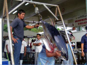 現地日本人スタッフにより魚体40kg以上の一本釣り大型キハダマグロを選別し、毎日約200本の買付けをしています。 |